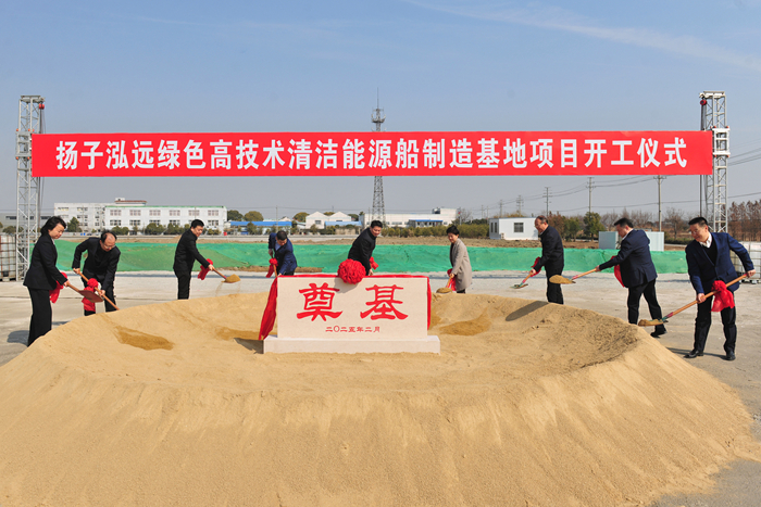2月19日,揚(yáng)子泓遠(yuǎn)綠色高技術(shù)清潔能源船制造基地項(xiàng)目(以下簡稱“揚(yáng)子泓遠(yuǎn)項(xiàng)目”)舉行奠基儀式,正式開工建設(shè)。靖江市委副書記、市政府市長申強(qiáng)主持儀式并致辭,我集團(tuán)董事長、總經(jīng)理任樂天現(xiàn)場(chǎng)致辭。泰州市委書記姜冬冬宣布項(xiàng)目開工。泰州市委副書記、市長萬聞華,市委常委、常務(wù)副市長沈峻峰,市政府秘書長包亞,靖江市政府、人大、政協(xié)主要負(fù)責(zé)同志出席儀式,并為揚(yáng)子泓遠(yuǎn)綠色高技術(shù)清潔能源船制造基地項(xiàng)目培土奠基。