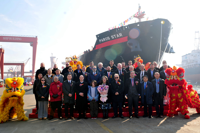 1月9日上午,我集團與船東CHARTWORLD共同為本船舉行了隆重的命名儀式。命名人Eleni Katsari女士,CHARTWORLD船東代表Stefanos Kollakis先生,CHARTWORLD公司執(zhí)行董事Antonis Faraklas先生,英國勞氏船級社(LR)全球?qū)張D中心總裁李天翔先生,衛(wèi)獅集團商務(wù)總監(jiān)Jamas Muir先生,我集團副總經(jīng)理兼新?lián)P子造船總經(jīng)理杜成忠先生以及相關(guān)合作方代表等領(lǐng)導(dǎo)和嘉賓出席了儀式。Eleni Katsari女士將新船命名為“PAROS STAR”輪,為新船砍纜、擲香檳禮、拉響汽笛。大家祝福這艘承載著夢想與希望的巨輪,在未來的航程中乘風(fēng)破浪、一帆風(fēng)順,為船東、租家?guī)碓丛床粩嗟臋C遇與財富!