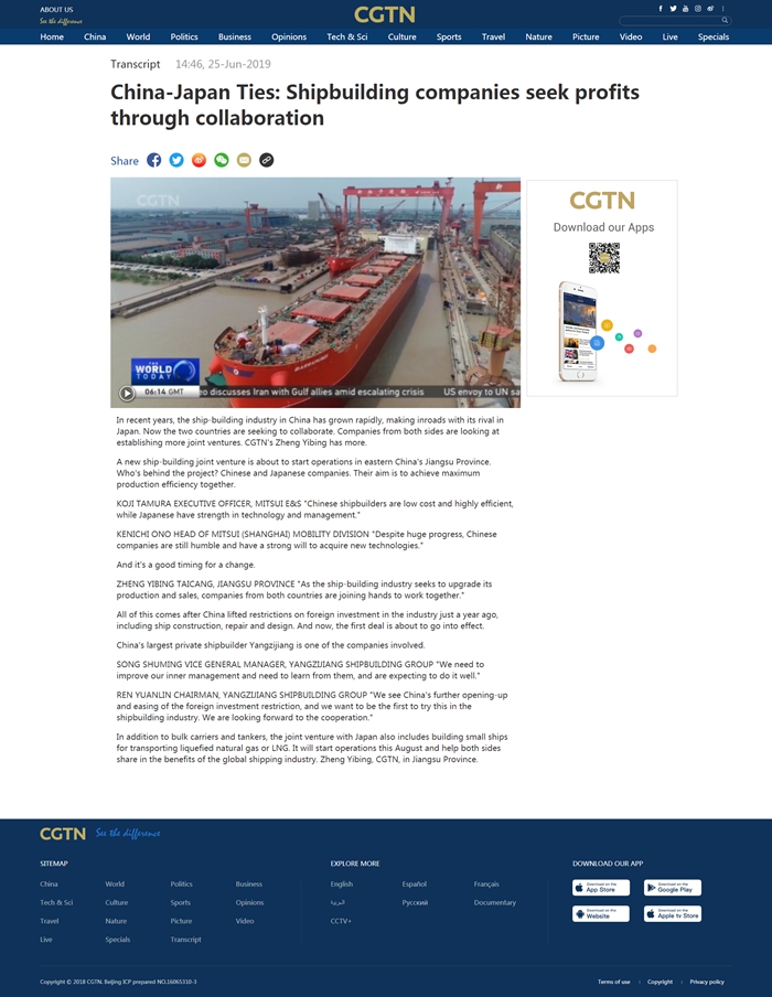 近年來,中國造船業(yè)迅猛發(fā)展,與日本船企形成了競爭?,F(xiàn)兩國正致力于尋求在造船方面合作共贏,兩國企業(yè)均期望建立更多合資公司。CGTN的鄭亦冰帶來以下最新報道。